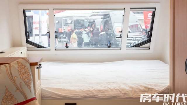 车身前方为休息区,床铺配有椰棕乳胶床垫,增加车主睡眠舒适度,床铺尺寸可容纳一家三口休憩床侧还增设了大开窗,视野开阔,可以欣赏户外的美景,并给室内带来明亮光线笔者注意到这里还加装了小型储物柜和床头柜,为休息区增加储物空间。