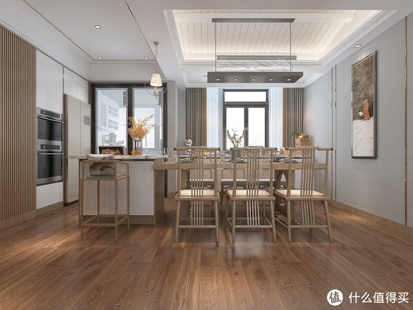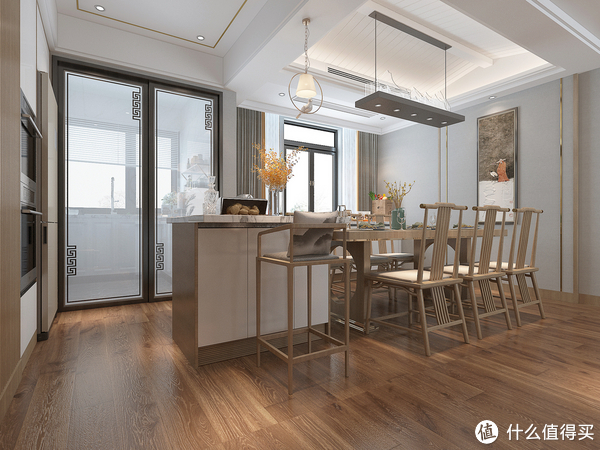 扩大后的餐厅空间面积更大,采光效果更好,整体的视觉感更佳,利用也更好,收纳也更多,也更加整体餐桌连接吧台一起,它的好处有很多,吃饭人多的时候可以坐得下,吧台还是一个吃早餐很合适的地方 餐厅的墙面做了一些玫瑰金颜色的不锈钢边条,点缀整个空间显得非常好看,靠窗边做了一排柜子,充分的利用好家里面每一寸空间。