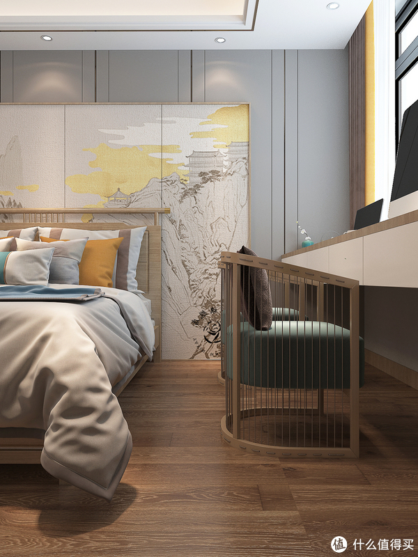 主卧的吊顶和灯具都和客餐厅采用了类似的设计手法,让每个空间各自分明又和谐一致床背景采用灰色系,提高了整个空间的明度和高级感,中式和现代的糅合呈现了新中式的独特魅力 原来开发商只预留了飘窗位置,并没有做飘窗,刚好利用这个位置做一排书桌,摆放一台台式电脑和一台笔记本,同时两夫妻一起办公都不会显得很拥挤。