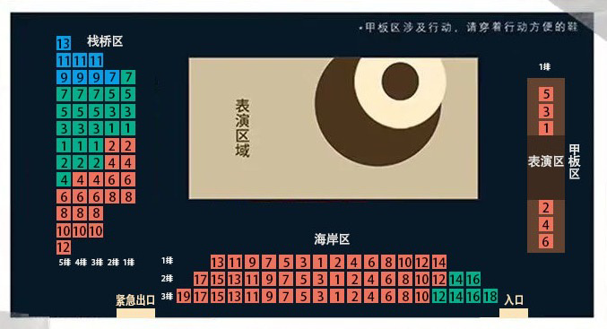 有观众形容这种体验是“帅哥脸贴脸对着你唱的音乐剧”“有眼神交流”观演区分三块甲板区互动最多,社恐朋友们慎选海岸区有好机位,适合拍美照栈桥区观剧无死角,follow全程