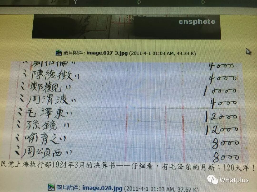 ▲辛亥老人喻育之不久,报纸被法国巡捕房查封,喻育之求救于孙中山,孙先生当即派人交涉,又批大洋300块,代缴罚金解围国共合作时期,有张工资单,喻育之80块,往上翻,毛泽东120块这张工资单的图片,现在外孙女林立手里。