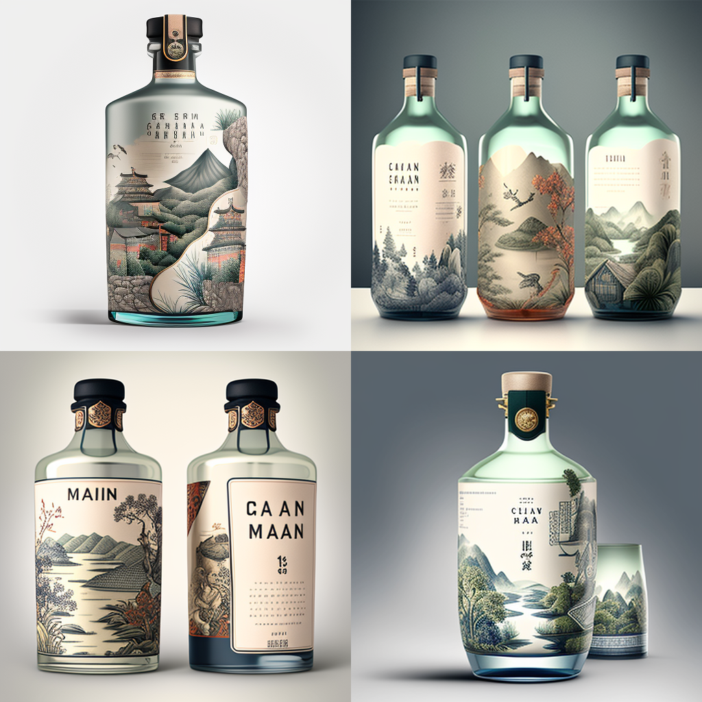 Midjourney设计的中国茶饮料PET瓶包装(图3)图片作者:Mote & Chain3、爱品酒的走起(1)中国风杜松子酒包装同事Jenny让它做一一款杜松子酒包装,中国风,现代感,带有长城元素(design a gin packaging, chinese style, great wall, modern)。