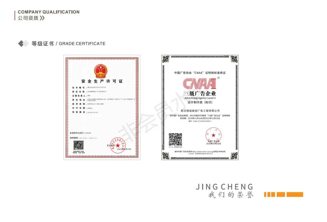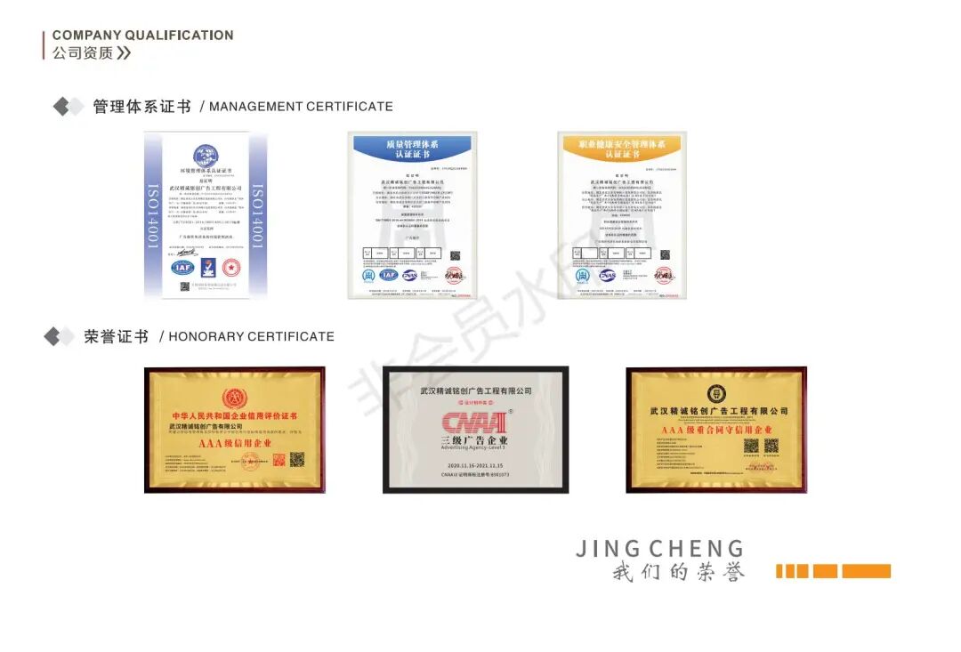 公司是湖北省标识行业协会副会长单位,武汉市广告协会副会长单位,武汉市杭州商会常务副会长单位,湖北会展业商会常务理事单位,中国AAA级信用企业20年来公司一直秉着坚持不懈,精益求精的态度,贯彻"让客户满意, 与客户共赢的经营宗旨,致力打造成为华中地区最大最专业的广告装饰工程- 站式采购基地,在广告行业内竖起一座标杆。