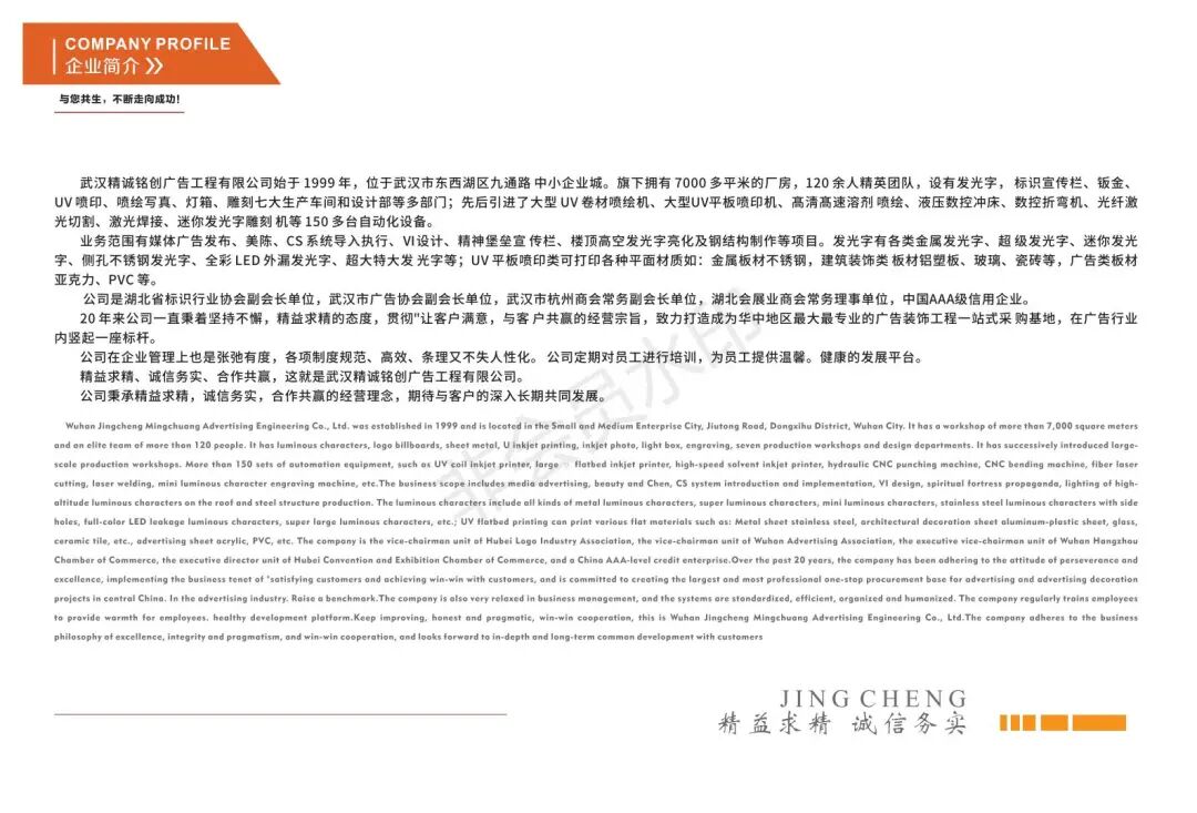武汉精诚铭创广告工程有限公司武汉精诚铭创广告工程有限公司始于1999年,位于武汉市东西湖区九通路中小企业城旗下拥有7000多平米的厂房,120余人精英团队,设有发光字,标识宣传栏、钣金、UV喷印、喷绘写真、灯箱、雕刻七大生产车间和设计部等多部门;先后引进了大型UV卷材喷绘机、大型UV平板喷印机、高清高速溶剂喷绘、液压数控冲床、数控折弯机、光纤激光切割、激光焊接、迷你发光字雕刻机等150多台自动化设备。