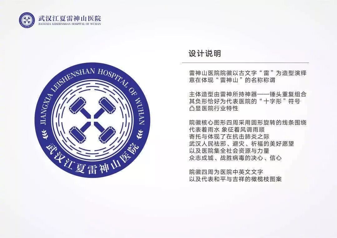 雷神山医院LOGO以「雷」的古文字为设计元素,锤子也是雷神的神器,四把锤子在中间形成「十」字医疗符号;周围一圈旋转的线条代表雨水,象征着风调雨顺,体现战胜瘟疫的美好愿望;与火神山不同,雷神山LOGO的文字中间装饰着象征和平的橄榄枝。