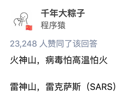 传说湖北人是火神祝融的后代,新型冠状病毒怕高温,而火神刚好能驱瘟神,于是“火神山”之名应运而生;而雷神是惩罚罪恶之神,凡犯下不可饶恕之罪的人,将遭受五雷轰顶,于是有了“雷神山”而知乎网友@千年大粽子 的回答更为经典:。