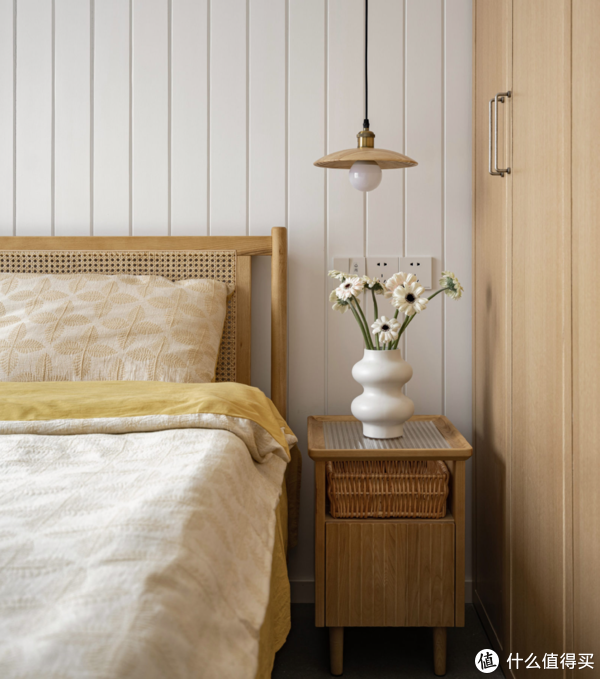 主卧在留白的基础上,将外面的空间元素做了一个整合比如同色系的木饰面床头,就渲染出了素雅温润的气息;比如编织硬包,就为空间增添了一抹温柔的质感;再比如棉麻材质的小吊灯,就在朴素中,让空间更加灵动自然了。