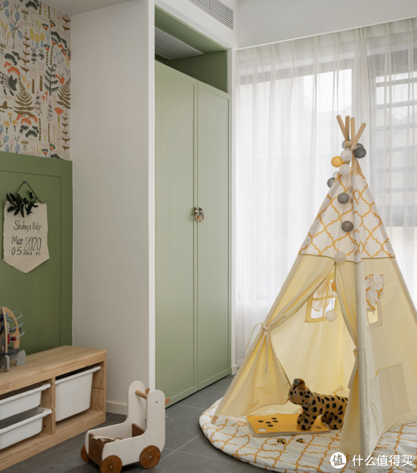 考虑到孩子还比较小,需要跟着大人一起住,所以儿童房的布局,也强调了灵活性。这样既不会影响到后期的布局调整,也让孩子有了一块玩耍的区域。而极度活泼的色彩元素运用,也给予了孩子一个有趣的成长环境。