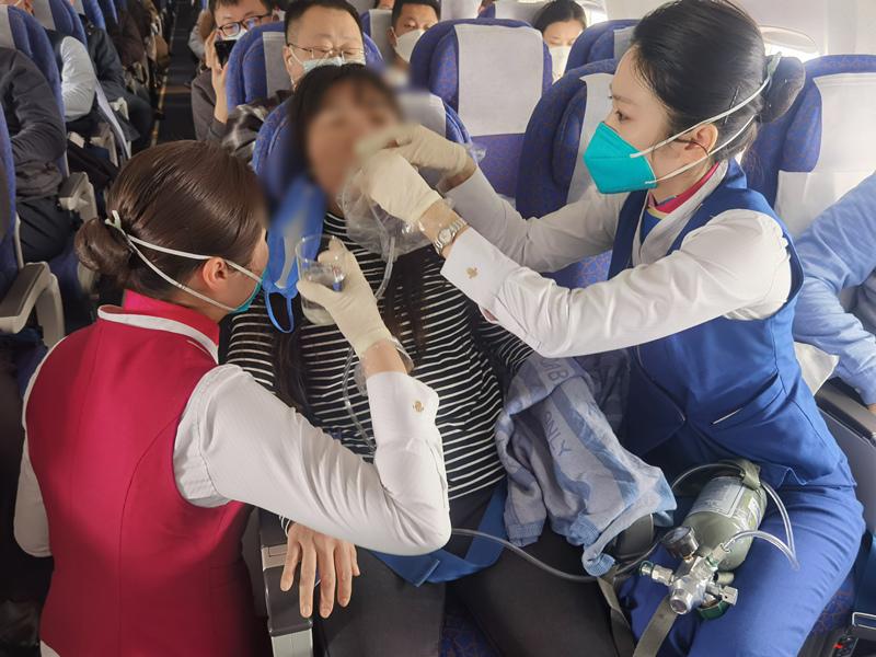 飞机从太原起飞后不久,一名旅客按呼唤铃呼叫乘务员,表示自己的妻子突发身体不适,非常难受乘务长郭玉立即上前查看,发现这名女性旅客呼吸急促、无法说话,身体僵硬瘫坐在座位上南航乘务组迅速启动机上紧急医疗处置程序,乘务长郭玉取出机上氧气瓶为旅客供氧,并通过客舱广播寻找医生。