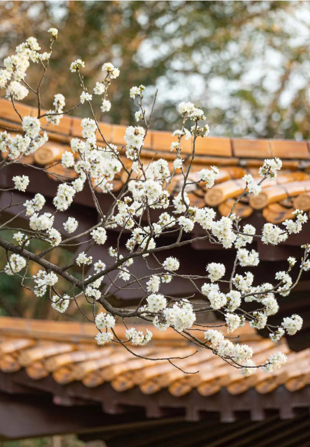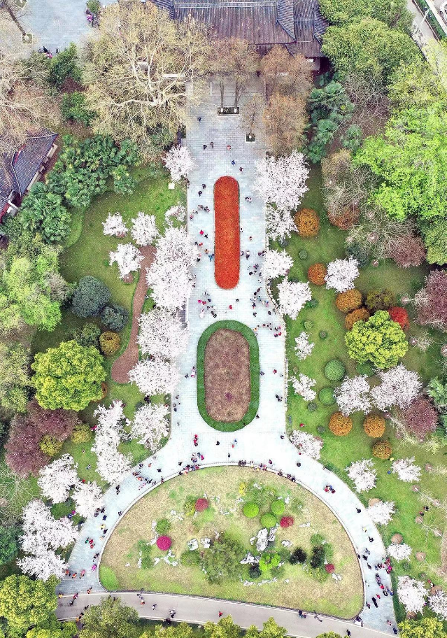🌸图源 | 武汉市文化和旅游局 青山公园是青山地区最大的樱花园,青山公园樱园种植有700株樱花,品种有9个在樱花苑里,白色和玫红的樱花开得正好,院墙旁的一株白色樱花盛放满树,与仿古建筑互相映衬,有种古典美。
