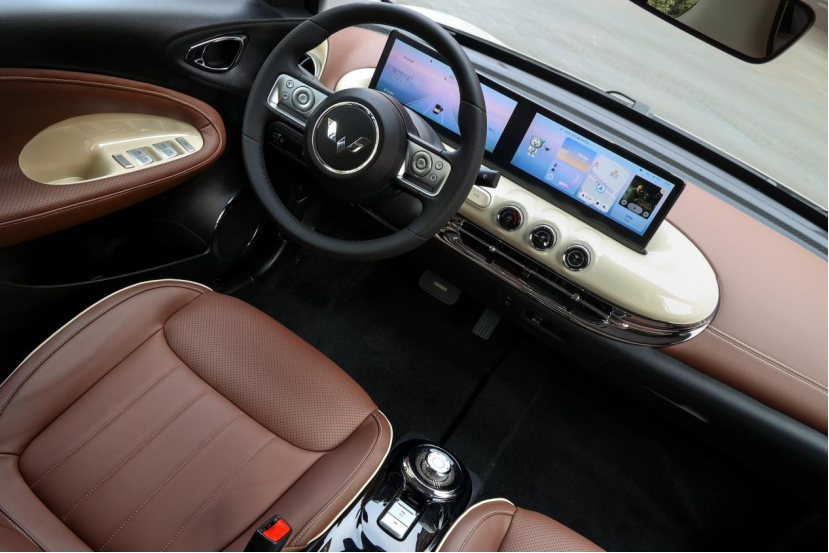 内饰部分,五菱缤果使用了了大面积的皮质包覆,触感和质感都不错,并且高亮镀铬、高亮烤漆和软质皮革的搭配,还增强了整个内饰的精致感值得一提的是,五菱缤果还搭载了双 10.25 英寸悬浮高清大联屏,让整个座舱显得精致的同时,又不失科技感。