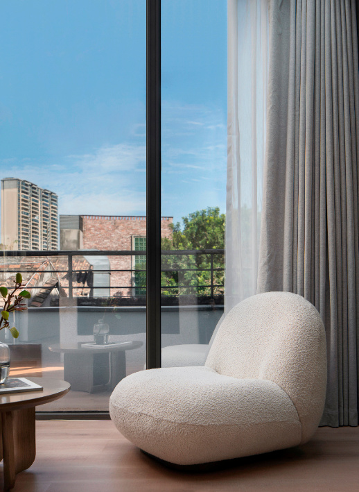 每个房间,都代表着一段故事,一份期待,大面积质朴的肌理近乎于自然的质感,真实的原始色调更有温度,构筑出一种私有的治愈性的体验感透过窗户外看,室内外相互映衬,不会有所脱轨,让人回归岭南人有细节生活态度
