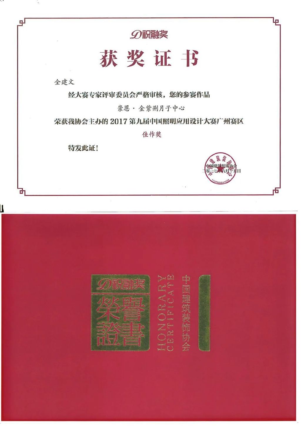 祝融奖(CBDA照明应用设计大赛),由中国建筑装饰协会于2009年正式启动,作为行业内专业的技术交流活动,祝融奖在建筑、室内设计、照明设计业内有着举足轻重的分量而在2017年,崇恩月子中心·世纪莲店作为参赛作品之一就已经在大赛中获得——佳作奖,得到业内的实力认证。