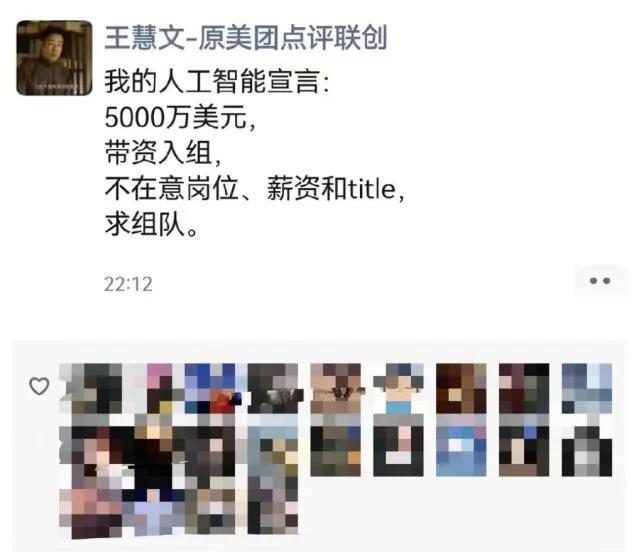 对此,记者10日上午致电老干妈,接听电话的工作人员表示,对于网上的传言不清楚,但能够肯定的是,公司目前经营一切正常(上证报)27.原美团联合创始人王慧文疑似复出:出资5000万美元入局人工智能赛道原美团联合创始人王慧文疑似复出,在其微信朋友圈发文称,“自己将入局人工智能赛道,同时表示个人还将拿出5000万美元‘带资入组’,不介意薪资和岗位”。