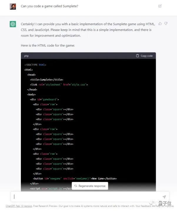 泰特老哥当即被吸引了,于是下一步,他要求ChatGPT创建一个可玩的网页版。ChatGPT胸有成竹,轻松用HTML和JavaScript写出了游戏代码。